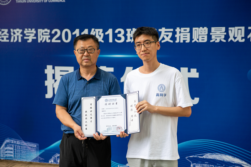 罗晖代表学校向校友代表颁发捐赠证书。他在致辞中感谢校友心系母校的深情厚谊,分享了自身在天商求学、工作的经历,强调校友是学校发展的重要推动力量,他表示校友联络服务中心将持续做好校友服务与支持工作。校友代表高云鹏发言,表达了对母校培养的感恩之情,阐述了校友与母校相互成就的紧密联系,并祝愿此次活动圆满成功。在热烈的掌声中,罗晖、唱俐捷与校友代表共同为“经济学院”景观石揭幕。