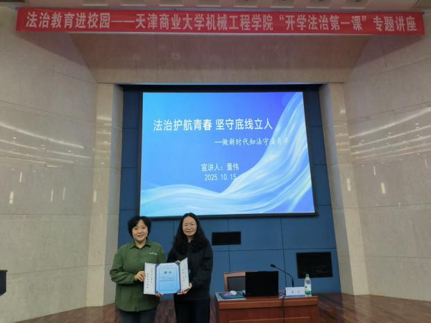 讲座开始前,张莹为董伟颁发聘书,聘任其为机械工程学院校外法治辅导员。