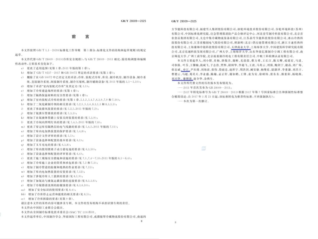 近日,由机械工程学院退休教师申江、热能与动力工程实验中心教师刘兴华与康博强参与制定的国家标准《冷库安全规程》(GB/T 28009-2025)正式发布。该标准由全国制冷标准化技术委员会(SAC/TC 119)归口、国家市场监督管理总局与国家标准化管理委员会联合发布,是我国在该领域的重要标准之一。