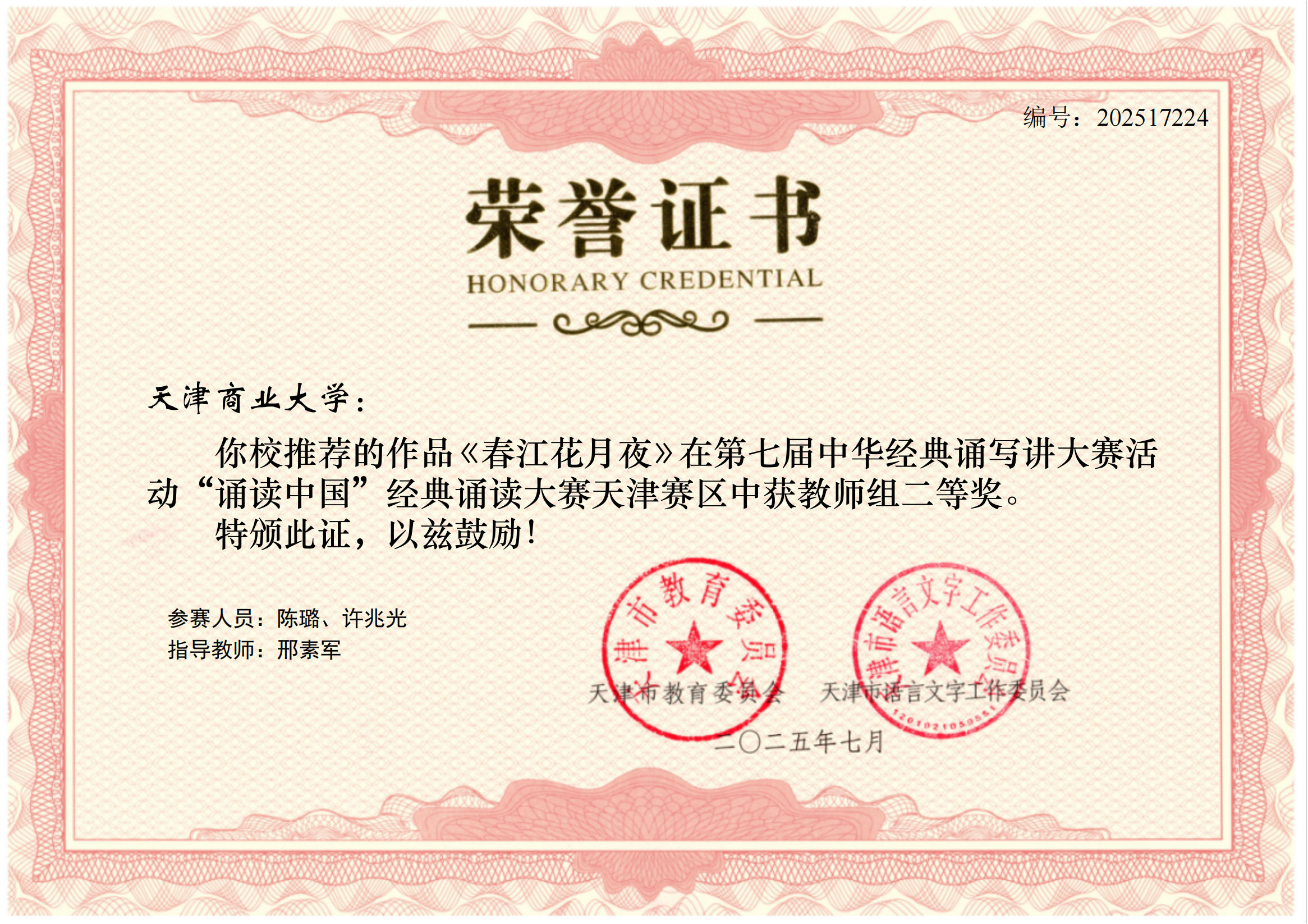 近日,第七届中华经典诵写讲大赛落下帷幕,我校教师选送的朗诵作品获得“诵读中国”经典诵读大赛天津赛区教师组二等奖一项。