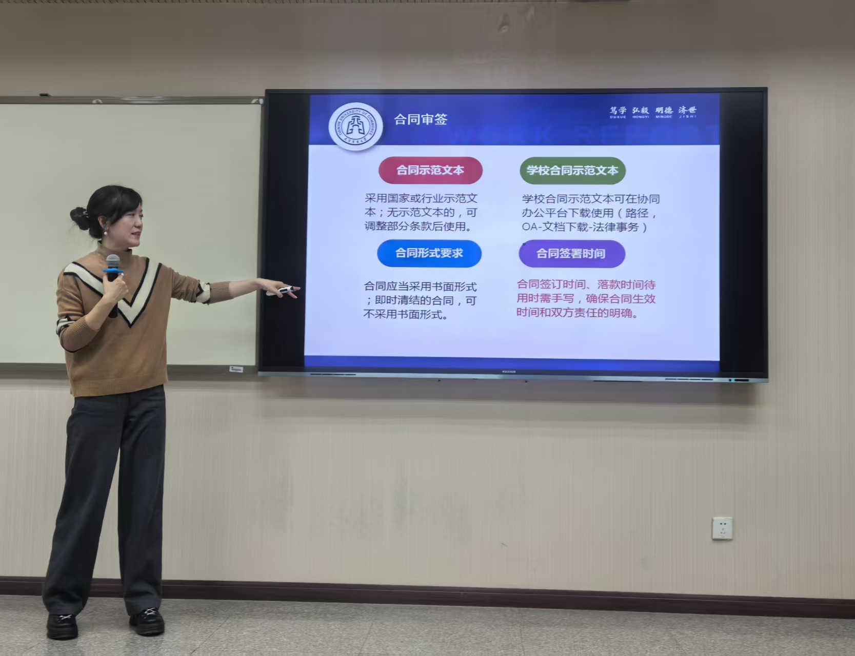 吕姝洁系统介绍了我校依法治校的制度框架与运行机制,结合工作实际,对合同审签的核心流程、关键节点与常见风险进行了细致剖析,通过典型案例提示合规审查与风险防范的实操要点。强调合同审签不仅是必要的管理程序,更是教师保护自身、规范履职的重要屏障,引导大家从入职之初就筑牢法治根基、恪守契约精神,将“依法执教、规范履职”内化为自觉的职业操守。