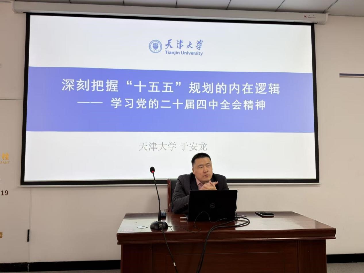 第二期聚焦“深刻把握‘十五五’规划的内在逻辑”,由天津大学马克思主义学院于安龙教授主讲。于安龙教授以清晰的逻辑脉络,通过四个核心问题层层递进,解锁“十五五”规划的深层要义:一是立足历史长河,精准定位“十五五”规划的历史方位,阐明其在全面建设社会主义现代化国家进程中的关键作用;二是锚定现实根基,系统梳理“十五五”规划的现实起点,结合“十四五”收官成果,分析规划制定的实践依据;三是深挖理论内核,阐释“十五五”规划蕴含的“继承与创新相统一、目标与路径相契合、全局与局部相协调”的发展逻辑;四是聚焦实践落点,详解“十五五”时期在科技创新、民生改善、国家安全等领域的重大任务,展现了规划的实践性与可操作性。讲座学理性强、信息量饱满,以严密的逻辑链条将历史、现实与未来紧密衔接,帮助师生构建起对全会精神与“十五五”规划的整体性认知。