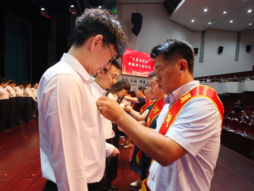 获奖教师代表经济学院孙云鹏和理学院狄佩佩分别《以科研之笔绘育人蓝图以双碳之责践师者担当》和《以师者之爱 照亮青春之路》为题作主题分享。师德标兵为新入职教师代表佩戴校徽,全体新入职教师面对国旗庄严宣誓,管理学院米学娇代表新入职教师发言。