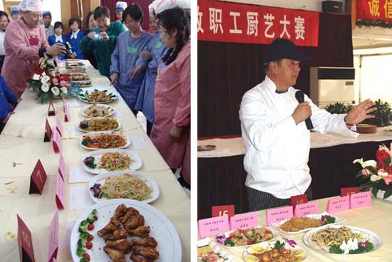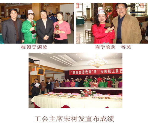 这是校工会首次举办厨艺大赛,全校各分会都派出了最强阵容,不仅有女教职工,也吸引了许多男教工前来助阵。大家在赛前研究制定菜谱,切磋烹饪技术,了解食物营养搭配的科学知识,为比赛做了充分的准备。本次比赛要求在限定时间内完成“规定菜”和“创意菜” 2 种菜品的烹制。赛场气氛热火朝天,人声鼎沸,十分热烈,从洗菜、切菜、配菜到煎、炒、烹、炸,大家忙得不亦乐乎。当一盘盘色香味俱全的菜肴呈现在桌上时,让大家赞不绝口,垂涎三尺。评委分别从色、香、味、形、刀工、创意、营养搭配、家庭实用等方面进行评分。最后,商学院获得一等奖;后勤产业,饮食集团联队,国际教育与交流、 TF 合作学联队获得二等奖;生食学院、机械学院、机关一与机关二联队、公共管理学院、高继学院联队、外语学院获得优秀奖。
