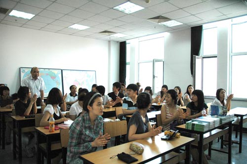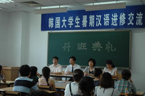 7 月1 日 ,国际教育学院迎来了 2009 暑期第一个访问团——来自韩国国立忠北大学、忠清大学、韩中文化教育院的 19 名在校大学生来我校进行暑期汉语进修。 7月3 日 ,进修班举行了开班典礼。国际教育学院领导寇小萱、郑志明,留学生管理人员,汉语教学教师参加了典礼。寇小萱院长代表学院讲话,她对学员们的到来表示欢迎,希望同学们在炎热的夏季注意身体健康,取得理想的交流与进修效果。教师代表王立杰,学生代表郑娜丽分别发言。