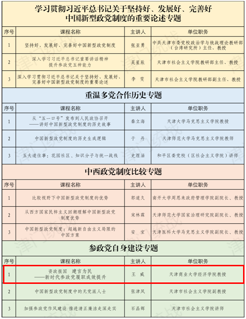近日,市委统战部公布了2025年度天津市“中国新型政党制度”精品课评选结果,我校经济学院教师王威讲授的《资政报国 建言为民——新时代参政党履职成效提升》课程获评。