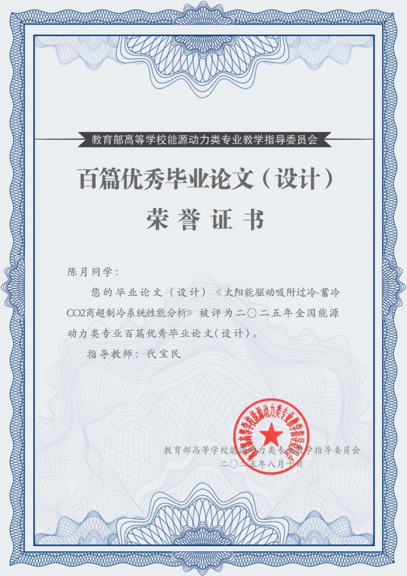 8月11日,由教育部高等学校能源动力类专业教学指导委员会主办的2025年度(第五届)全国能源动力类专业优秀本科毕业论文(设计)展示交流活动在东北石油大学落下帷幕。由机械工程学院代宝民老师指导的能源与动力工程专业2021 级卓越工程师班毕业生陈月的本科毕业论文入选,这是我校毕业生首次获得该奖项。