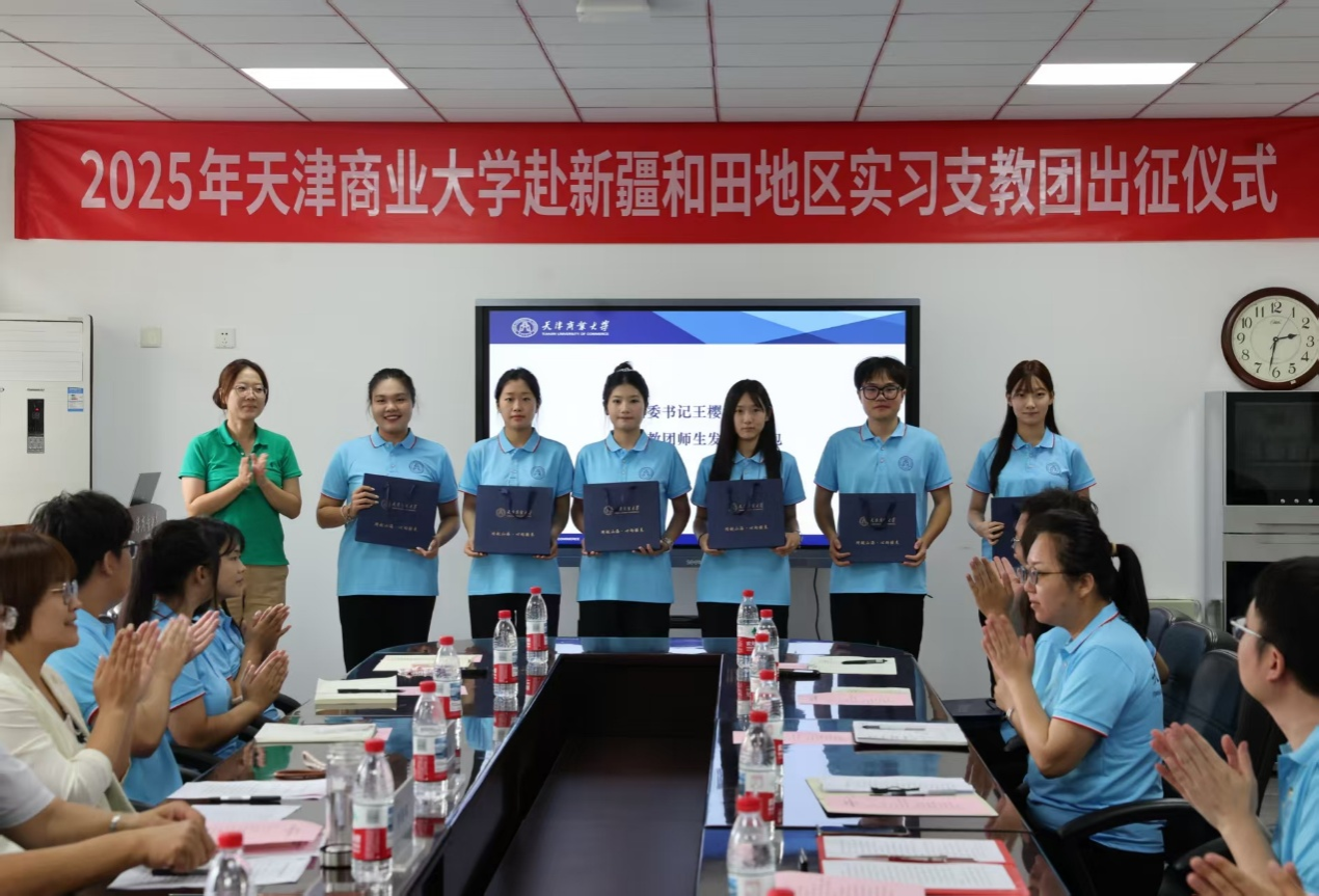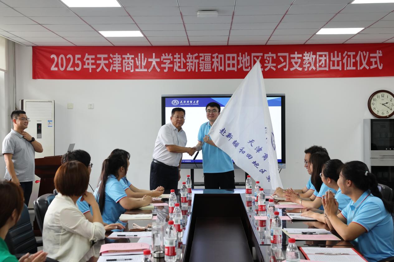 9月15日下午,天津商业大学赴新疆和田地区实习支教团出征仪式在行政楼多功能会议室举行。副校长齐恩平教授出席并向实习支教团授旗。党委学工部、团委负责同志,相关学院党委副书记,2024年实习支教团师生代表和2025年实习支教团全体师生参加。会议由党委学工部主要负责同志主持。