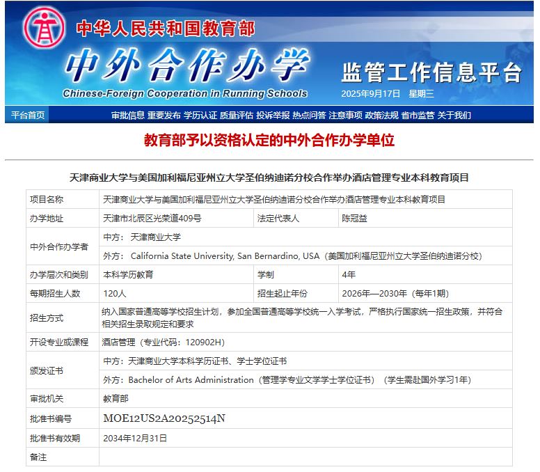 近日,天津商业大学与美国加利福尼亚州立大学圣伯纳迪诺分校合作举办酒店管理专业本科教育项目获教育部批准设立。这是我校国际化办学中的又一标志性成果,为我校切实推进高水平教育开放,引进境外优质的办学理念、教学方法和管理经验,促进我校教育教学质量和管理水平的提升,强化我校的办学特色和专业优势搭建了新的平台。