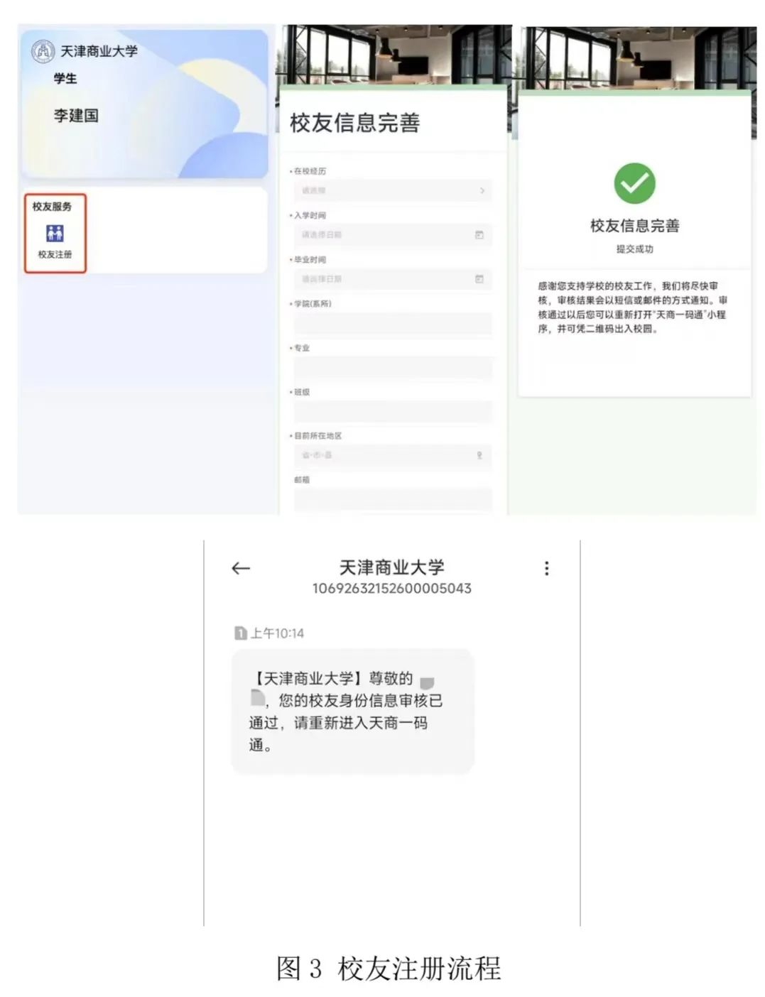 3.实名登录后,通过“校友注册”应用完善个人信息,后台将对校友信息进行审核,审核结果将以短信方式通知。