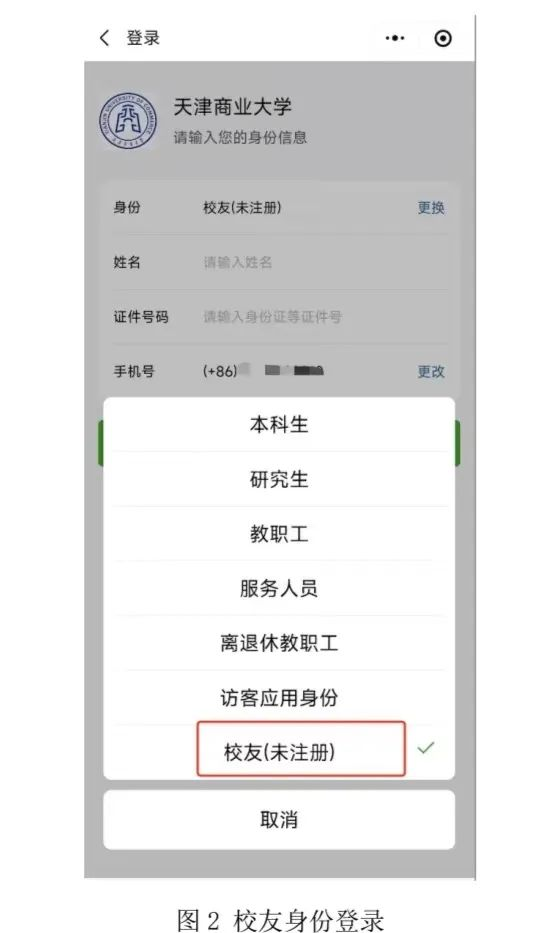 2.填写个人实名信息并选择“校友(未注册)”身份登录。